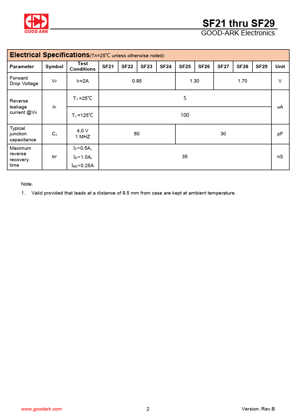 of changes Released Datasheet Modify document format .goodark. Rev.B SF21 thru SF29 GOOD-ARK Electronics Disclaimers These materials are intended as a reference to assist our customers in the selection of the Suzhou Good-Ark product best suited to the customer’s application; they do not convey any license under any intellectual property rights, or any other rights, belonging to Suzhou Good-Ark Electronics Co.,...