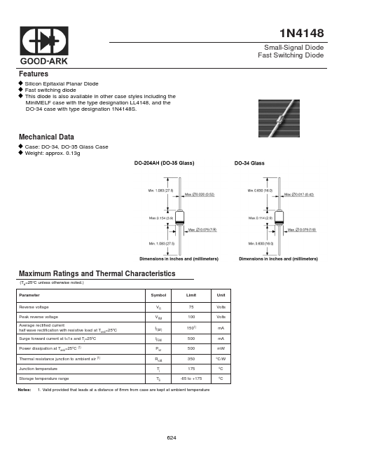 Features Silicon Epitaxial Planar Diode Fast switching diode This diode is also available in other case styles including the MiniMELF case with the type designation LL4148, and the DO-34 case with type designation 1N4148S. DO-34, DO-35 Glass Case Weight: Valid provided that leads at a distance of 8mm from case are kept at ambient temperature 624 (TJ=25oC unless otherwise noted.) Parameter Symbol Test Condition Min.