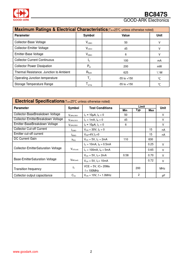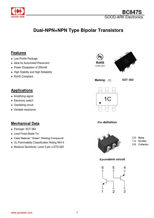 Overview: BC847S GOOD-ARK Electronics Dual-NPN+NPN Type Bipolar Transistors.