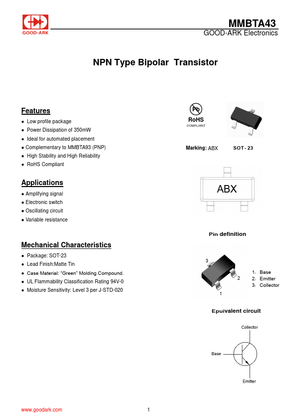 Overview: MMBTA43 GOOD-ARK Electronics NPN Type Bipolar Transistor.