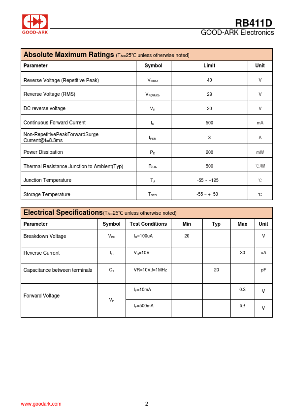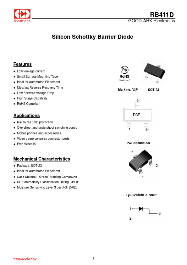 Overview: RB411D GOOD-ARK Electronics Silicon Schottky Barrier Diode.