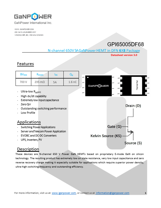 These devices are N-channel 650 V Power GaN HEMTs based on proprietary E-mode GaN on silicon technology. The resulting product has extremely low on state resistance, very low input capacitance and zero reverse recovery charge making it especially suitable for applications which require superior power density, ultra-high switching frequency and outstanding efficiency.