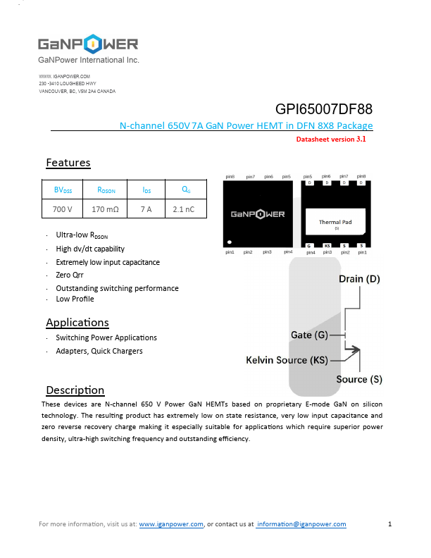 - 9 VDS=VGS, ID=5mA (TJ=150 oC) 2 BVDSS Drain-Source breakdown voltage VGS=0V, ID < 20 µA (TJ=25 OC) 3 IDSS Zero gate voltage drain leakage VGS=0V, VDS= 650V current TJ = 25 ℃ 4 IGSS Gate-Source Leakage VGS = 6V, VDS = 0V VGS=6V, ID=1.4A TJ = 25 ℃ 5 RDSON drain-source on resistance VGS=6V, ID=1.4A TJ = 150 ℃ 6 VSD Reverse conduc on voltage ISD=0.2A, VGS=0V