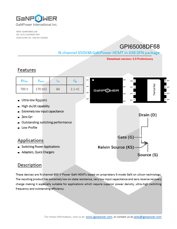 These devices are N-channel 650 V Power GaN HEMTs based on proprietary E-mode GaN on silicon technology. The resulting product has extremely low on state resistance, very low input capacitance and zero reverse recovery charge making it especially suitable for applications which require superior power density, ultra-high switching frequency and outstanding efficiency.