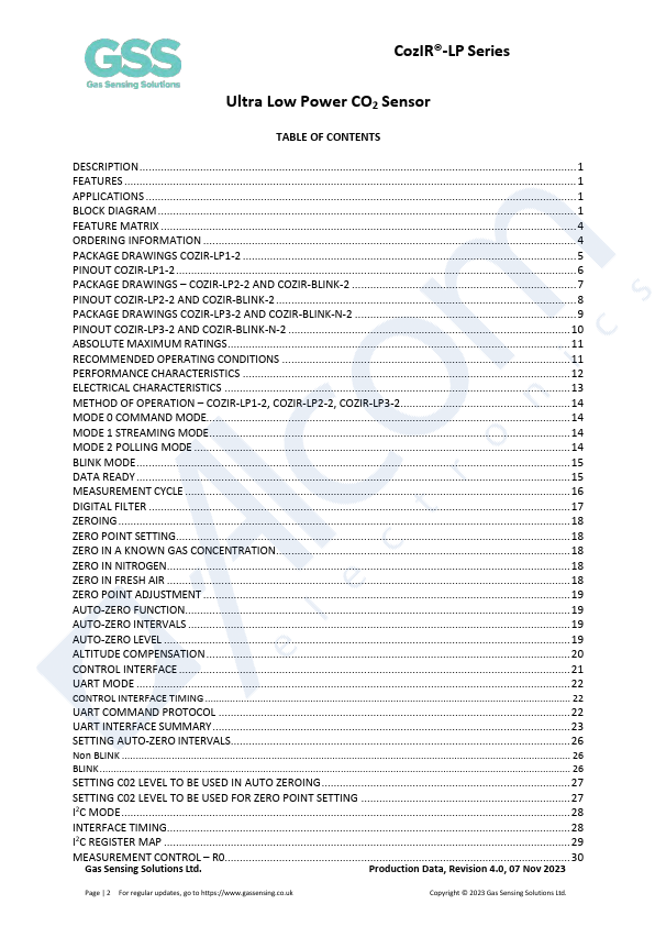 FEATURES The CozIR®-LP series is a set of low power NDIR CO2 sensors using state-of-the-art solid-state LED optical technology. The low power LEDs are manufactured in-house, giving GSS plete control of the CO2 sensor signal chain. Low power CO2 sensor +/-(30ppm+3%rdg) typical measurement accuracy Solid state NDIR LED optical technology UART control and data interface Built-in auto-zeroing The CozIR®-LP series low...