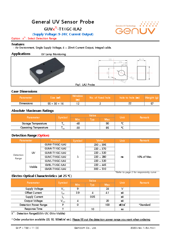 General UV Sensor Probe GUVx1)-T1XGC-ILA2 (Supply Voltage: 9-24V, Current Output) Option.