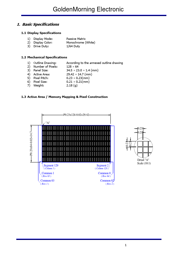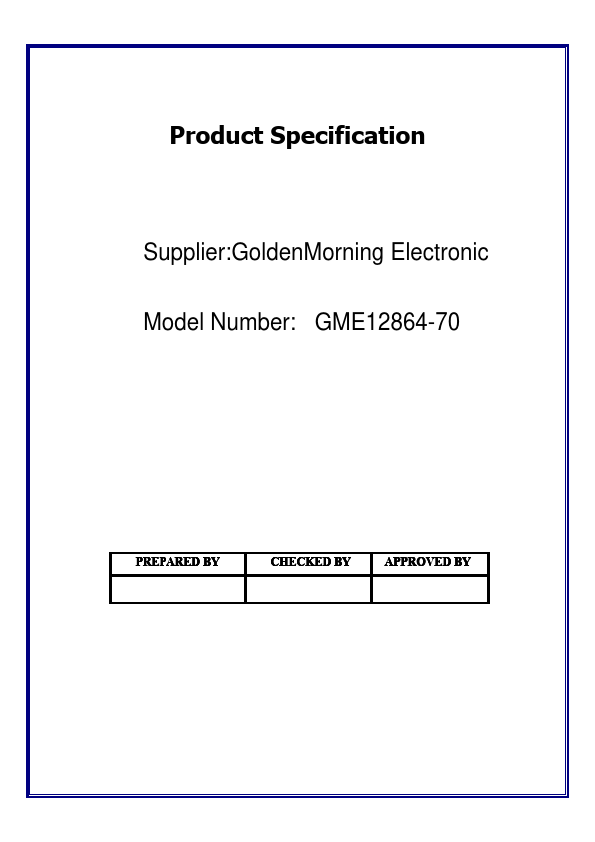 Product Specification Supplier:GoldenMorning Electronic Model Number: GME12864-70 PREPARED BY CHECKED BY APPROVED BY GoldenMorning Electronic Contents Revision History Contents 1. Basic Specifications 1.1 Display Specifications 1.2 Mechanical Specifications 1.3 Active Area / Memory Mapping & Pixel Construction 1.4 Mechanical Drawing 1.5 Pin Definition.