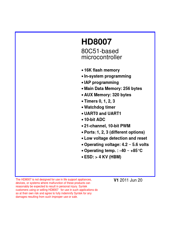 The HD8007 is not designed for use in life support appliances, devices, or systems where malfunction of these products can reasonably be expected to result in personal injury. Syntek customers using or selling HD8007 for use in such applications do so at their own risk and agree to fully...