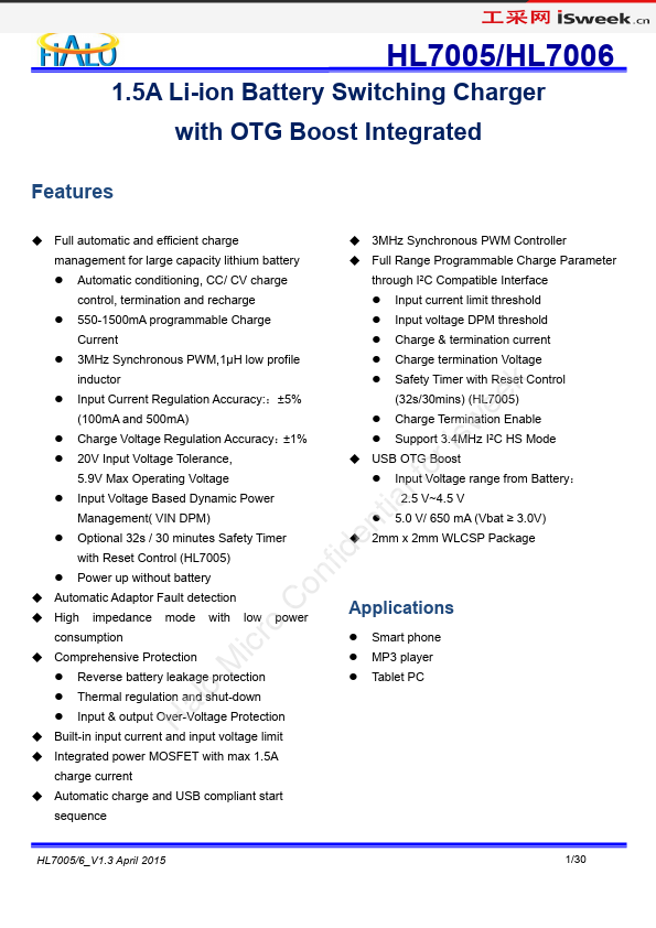 icicroro HL7005/6 is a pact, flexible, high-efficiency, USB pliant switch-mode charge management device MM for single cell Li-ion and Li-polymer battery used in a lolo wide range of portable applications. The charge HHaa parameters can be programmed through I2C HL7005/6 provides a plete automatic threephase battery charging control: trickle charge, constant-current charge (CC) and constant voltage charge (CV) until...