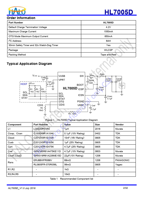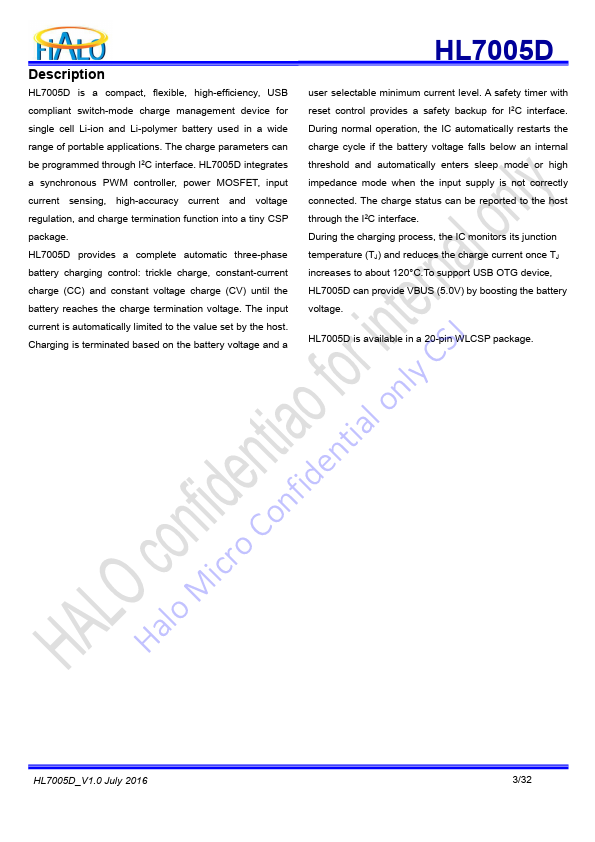 HL7005D is a pact, flexible, high-efficiency, USB user selectable minimum current level. A safety timer with pliant switch-mode charge management device for reset control provides a safety backup for I2C interface. single cell Li-ion and Li-polymer battery used in a wide During normal operation, the IC automatically restarts the range of portable applications.