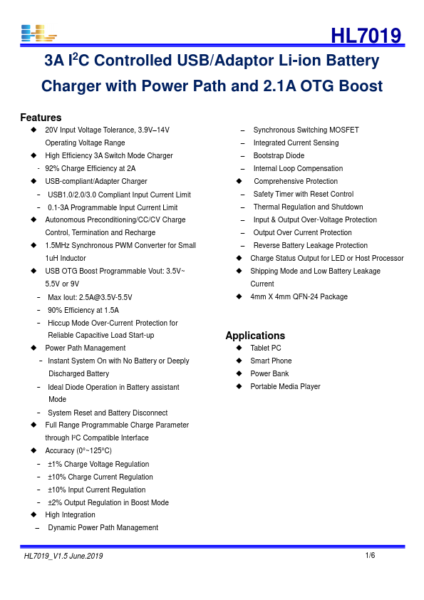 HL7019 3A I2C Controlled USB/Adaptor Li-ion Battery Charger with Power Path and 2.1A OTG Boost.