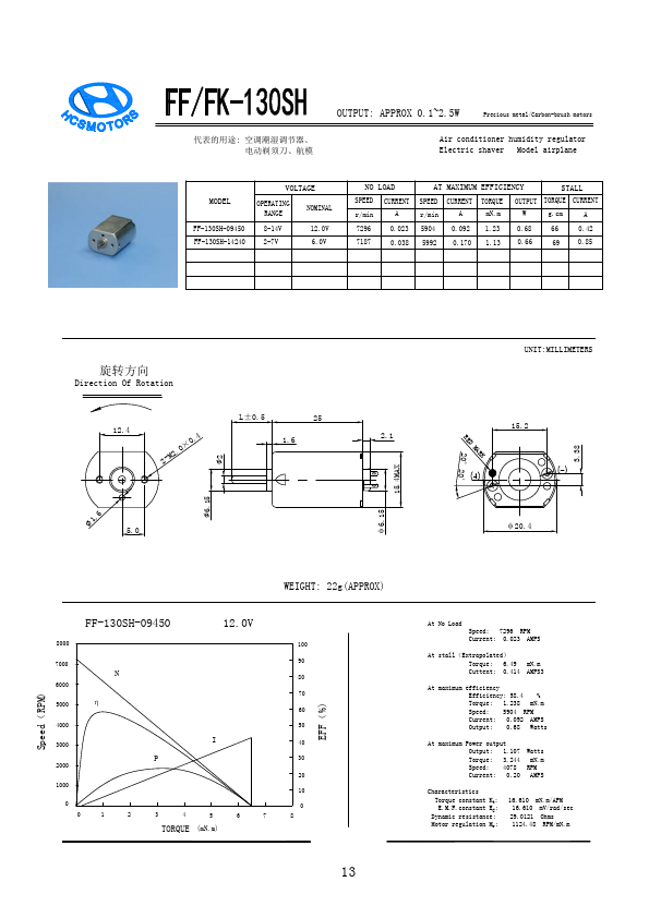 空调潮湿调节器、 电动剃须刀、航模 OUTPUT: 0.023 AMPS At stall(Extrapolated) Torque: 0.414 AMPS3 At maximum efficiency Efficiency:.