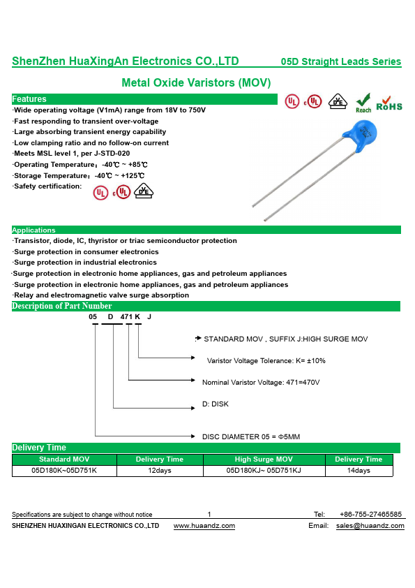 • Wide operating voltage (V1mA) range from 18V to 750V