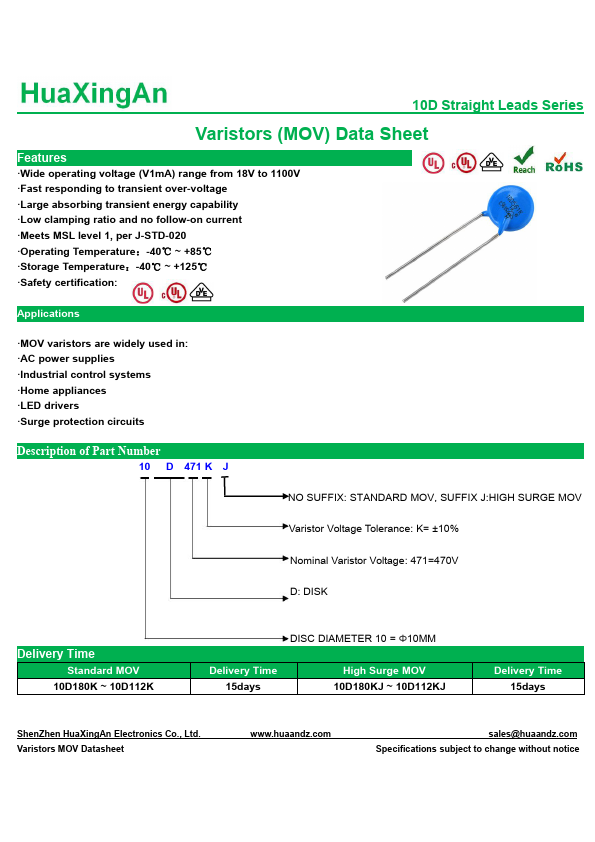 - Wide operating voltage (V1mA) range from 18V to 1100V