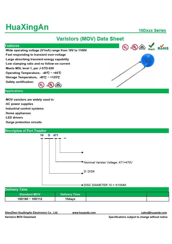 • Wide operating voltage (V1mA) range from 18V to 1100V