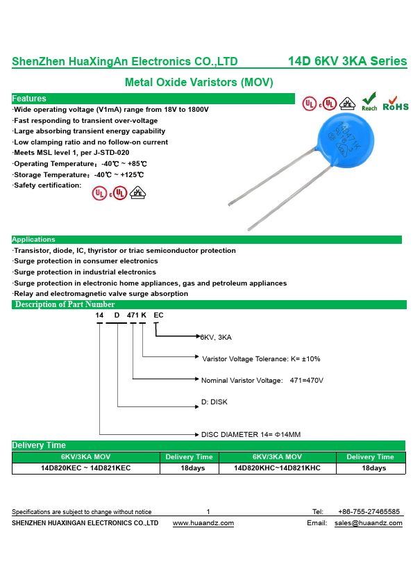 of Part Number 14 D 471 K EC 6KV, 3KA Varistor Voltage Tolerance: K= ±10% Nominal Varistor Voltage: 471=470V D: DISK Delivery Time 6KV/3KA MOV 14D820KEC ~ 14D821KEC DISC DIAMETER 14= Φ14MM Delivery Time 18days 6KV/3KA MOV 14D820KHC~14D821KHC Delivery Time 18days Specifications are subject to change without notice SHENZHEN HUAXINGAN ELECTRONICS CO.,LTD 1 Tel: +86-755-27465585 Email: sales@ ShenZhen HuaXingAn Electronics CO.,LTD 14D 6KV 3KA Series Part Number Maximum Allowable Voltage Varistor Voltage Maximum Clamping Voltage VC(V) 6KV/3KA MOV VAC(V) VDC(V) V1mA(V) AT 25A 14D820KEC 14D101KEC 14D121KEC 14D151KEC 14D181KEC 14D201KEC 14D221KEC 14D241KEC 14D271KEC 14D301KEC 14D331KEC 14D361KEC 14D391KEC 14D431KEC 14D471KEC 14D511KEC 14D561KEC 14D621KEC 14D681KEC 14D751KEC 14D781KEC 14D821KEC 50 65 82(73.8 ~90.2) 135 60 85 100(90~110) 165 75 100 120(108~132) 200 95 125 150(135~165) 250 115 150 180(162~198) 300 130 170 200(180~220) 340 140 180 220(198~242) 360 150 200 240(216~264) 395 175 225 270(243~297) 455 190 250 300(270~330) 500 210 275 330(297~363) 550 230 300 360(324~396) 595 250 320 390(351~429) 650.