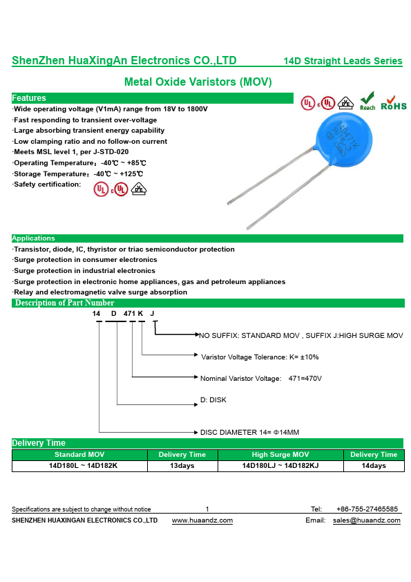 - Wide operating voltage (V1mA) range from 18V to 1800V