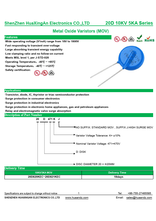 of Part Number 20 D 471 K J NO SUFFIX: STANDARD MOV , SUFFIX J:HIGH SURGE MOV Varistor Voltage Tolerance: K= ±10% Nominal Varistor Voltage: 471=470V D: DISK Delivery Time 10KV/5KA MOV 20D820KEC~20D821KEC DISC DIAMETER 20 = Φ20MM Delivery Time 18days Specifications are subject to change without notice SHENZHEN HUAXINGAN ELECTRONICS CO.,LTD 1 Tel: +86-755-27465585 Email: sales@ ShenZhen HuaXingAn Electronics CO.,LTD 20D 10KV 5KA Series Maximum Part Number Allowable Voltage 10KV/5KA MOV VAC(V) VDC(V) 20D820KEC 50 65 20D101KEC 60 85 20D121KEC 75 100 20D151KEC 95 125 20D181KEC 115 150 20D201KEC 130 170 20D221KEC 140 180 20D241KEC 150 200 20D271KEC 175 225 20D301KEC 190 250 20D331KEC 210 275 20D361KEC 230 300 20D391KEC 250 320 20D431KEC 275 350 20D471KEC 300 385 20D511KEC 320 415 20D561KEC 350 460 20D621KEC 385 505 20D681KEC 420 560 20D751KEC 460 615 20D781KEC 485 640 20D821KEC 510 670 Varistor Voltage Maximum Clamping Voltage Maximum Typical Safety Withstandin Surge Energy Capacitance Certificatio Current (10/1000μs) (Reference) n 1.2/50us & 8/20us V1mA(V) VC(V)AT100 A combination of wave,10KV/5KA (J) Sub 0,90,1.