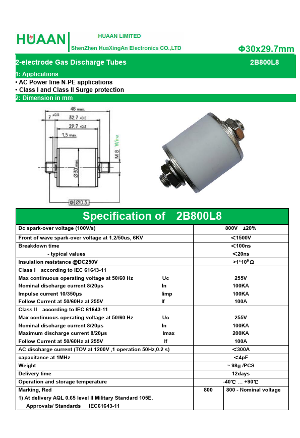 2B800L8 is 2-electrode Gas Discharge Tubes manufactured by HuaXingAn Electronics.