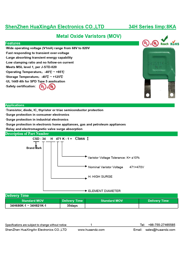 - Wide operating voltage (V1mA) range from 68V to 820V