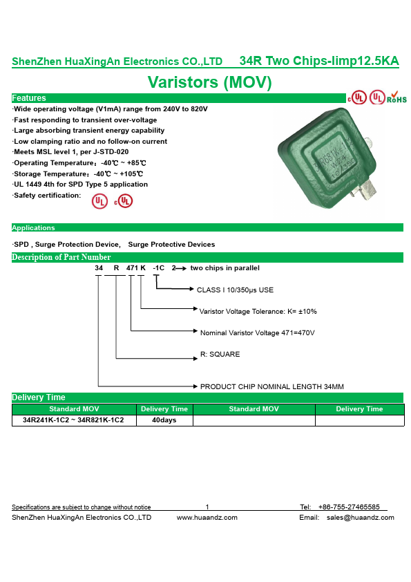 - Wide operating voltage (V1mA) range from 240V to 820V