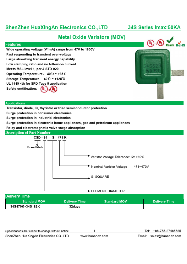 - Wide operating voltage (V1mA) range from 47V to 1800V