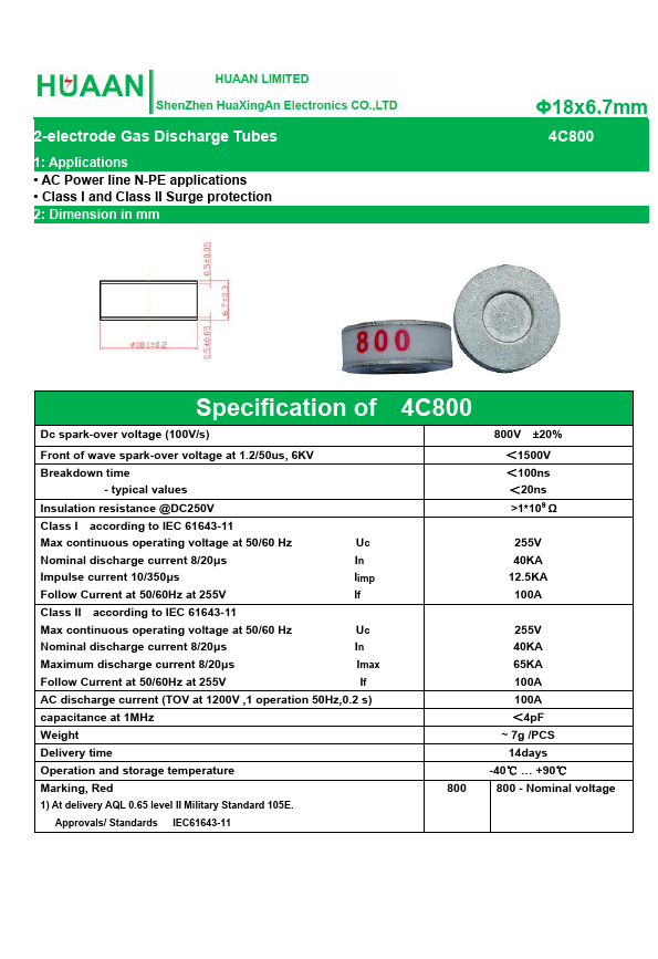 4C800 is 2-electrode Gas Discharge Tubes manufactured by HuaXingAn Electronics.