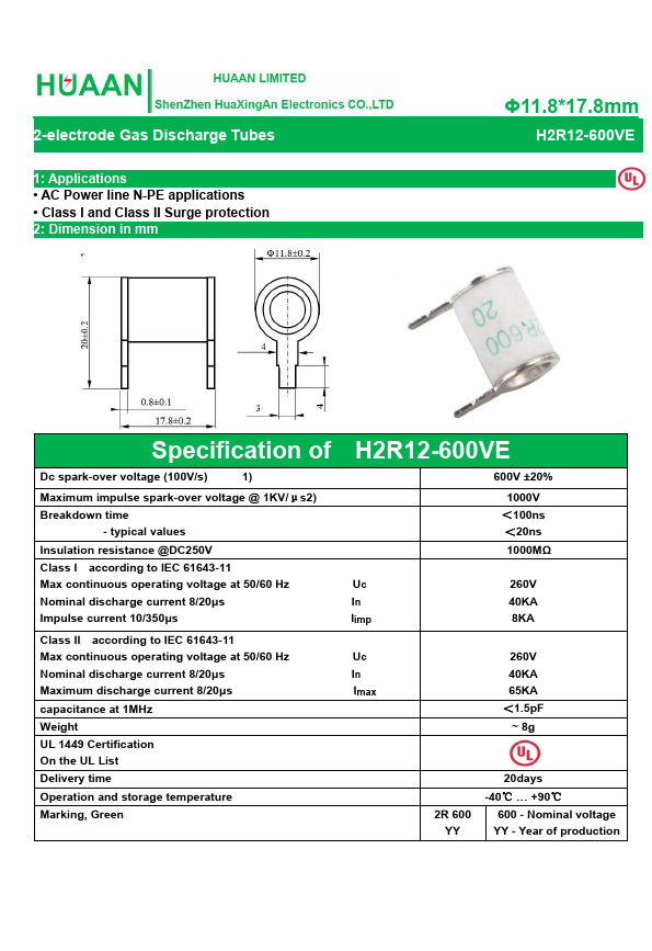 H2R12-600VE is 2-electrode Gas Discharge Tubes manufactured by HuaXingAn Electronics.