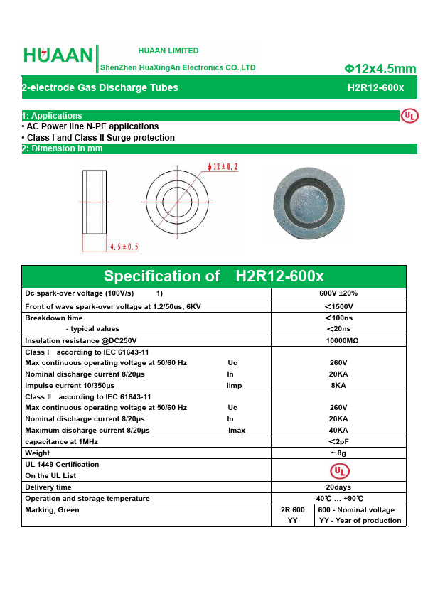 H2R12-600x is 2-electrode Gas Discharge Tubes manufactured by HuaXingAn Electronics.