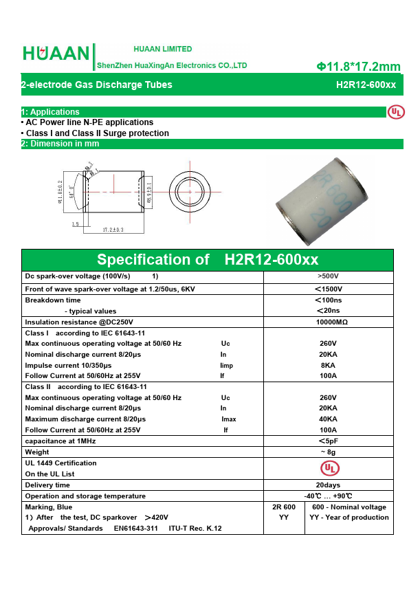 H2R12-600xx is 2-electrode Gas Discharge Tubes manufactured by HuaXingAn Electronics.