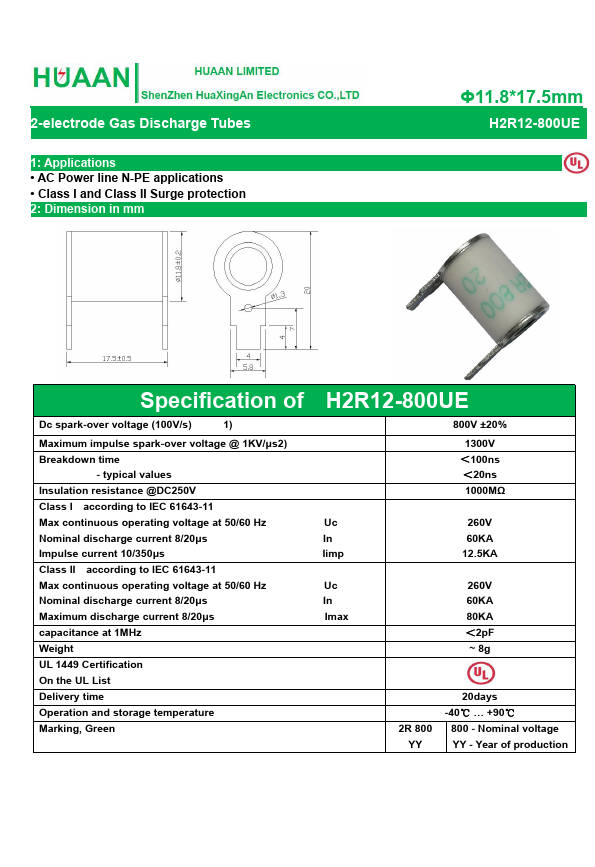 H2R12-800UE is 2-electrode Gas Discharge Tubes manufactured by HuaXingAn Electronics.