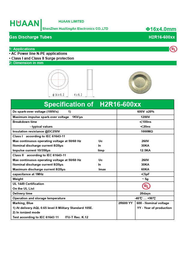 H2R16-600 is Gas Discharge Tubes manufactured by HuaXingAn Electronics.