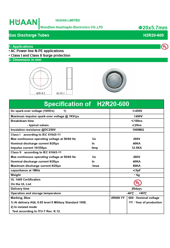H2R20-600 is Gas Discharge Tubes manufactured by HuaXingAn Electronics.