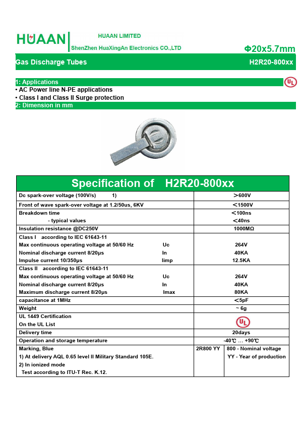 H2R20-800 is Gas Discharge Tubes manufactured by HuaXingAn Electronics.