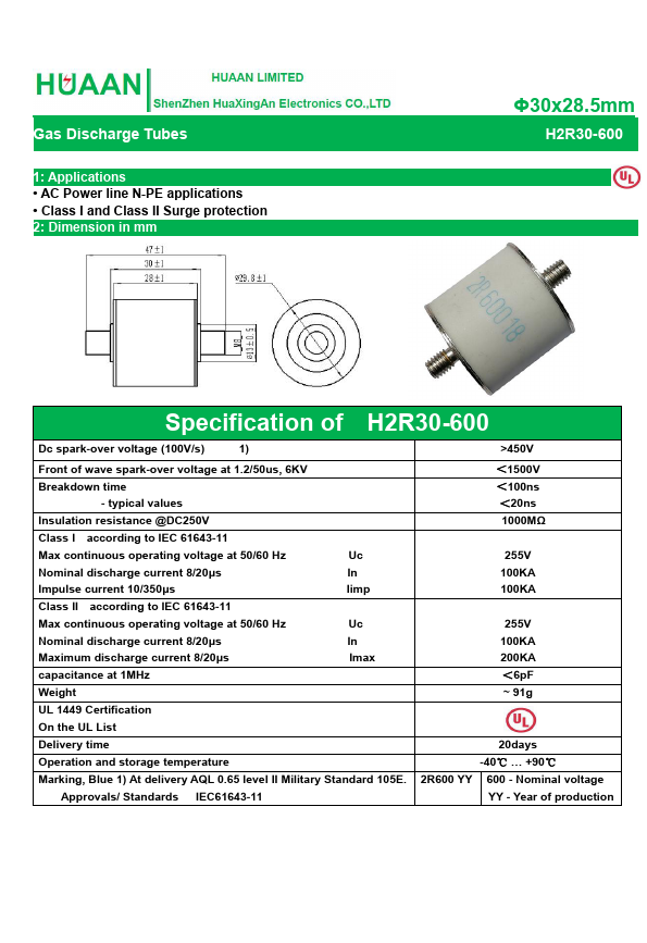H2R30-600 is Gas Discharge Tubes manufactured by HuaXingAn Electronics.