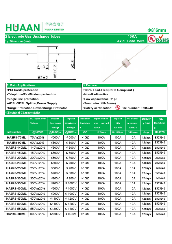 HA2R8-200ML is 2-Electrode Gas Discharge Tubes manufactured by HuaXingAn Electronics.