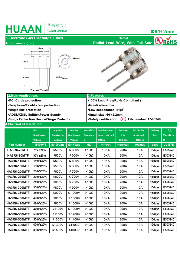 HA3R6-300MTF is 3-Electrode Gas Discharge Tubes manufactured by HuaXingAn Electronics.