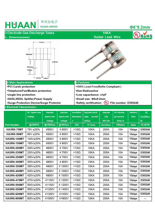 HA3R6-350MT is 3-Electrode Gas Discharge Tubes manufactured by HuaXingAn Electronics.