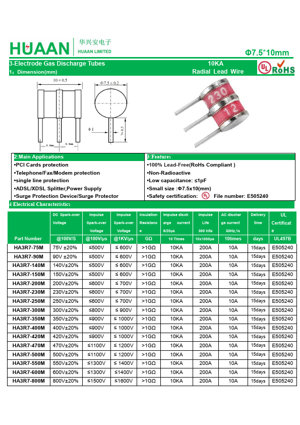 HA3R7-140M is 3-Electrode Gas Discharge Tubes manufactured by HuaXingAn Electronics.
