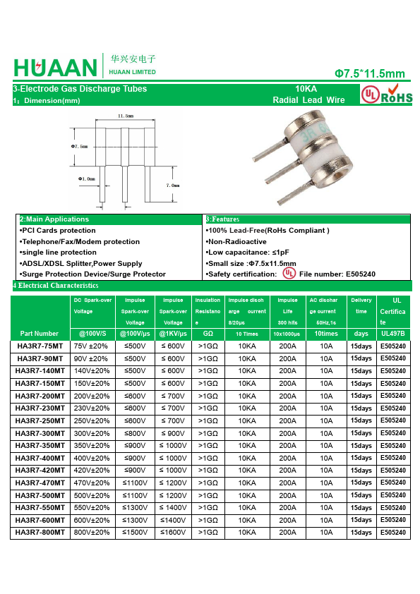 HA3R7-75MT is 3-Electrode Gas Discharge Tubes manufactured by HuaXingAn Electronics.