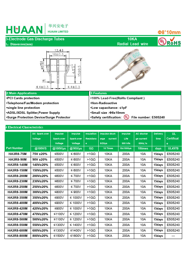HA3R8-800M is 3-Electrode Gas Discharge Tubes manufactured by HuaXingAn Electronics.
