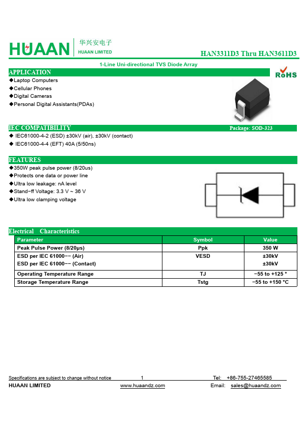 | Description | 1-Line Uni-directional TVS Diode Array |