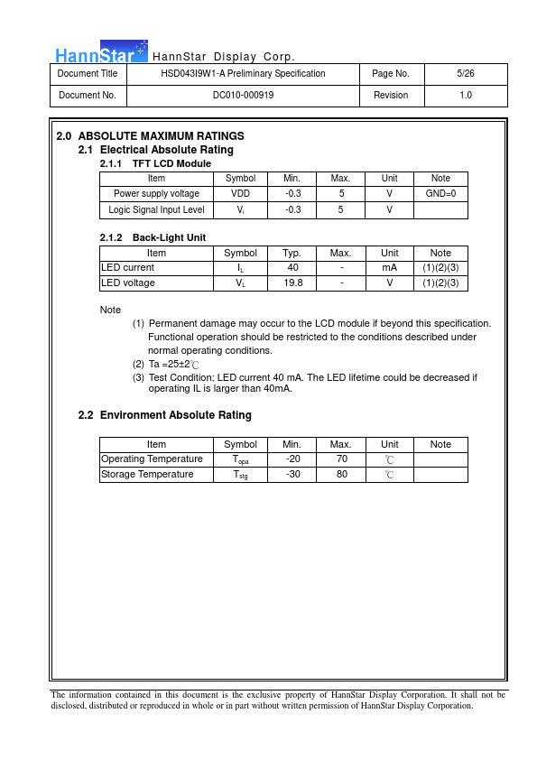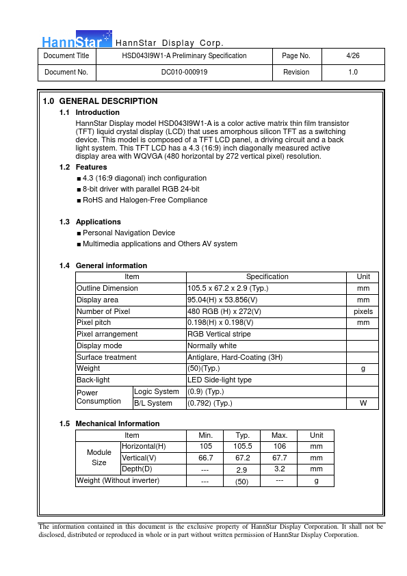 1.1 Introduction HannStar Display model HSD043I9W1-A is a color active matrix thin film transistor (TFT) liquid crystal display (LCD) that uses amorphous silicon TFT as a switching device. This model is posed of a TFT LCD panel, a driving circuit and a back light system. This TFT LCD has a 4.3 (16:9) inch diagonally measured active display area with WQVGA (480 horizontal by 272 vertical pixel) resolution.