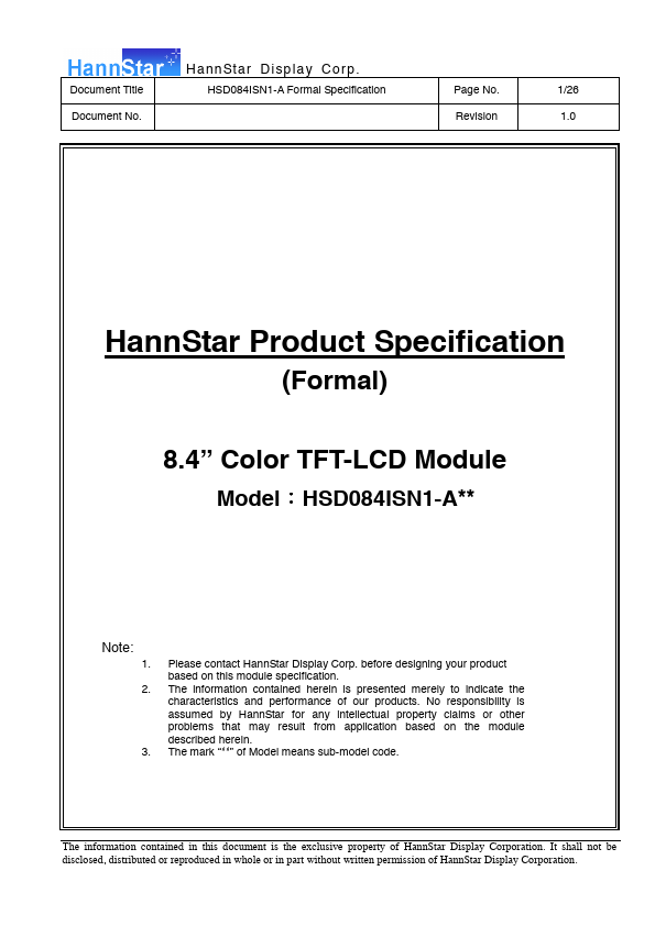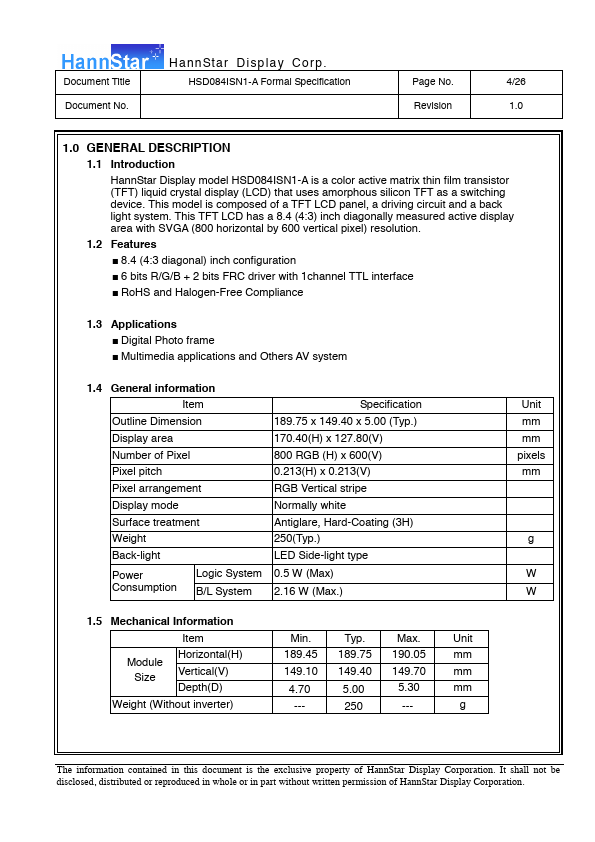 1.1 Introduction HannStar Display model HSD084ISN1-A is a color active matrix thin film transistor (TFT) liquid crystal display (LCD) that uses amorphous silicon TFT as a switching device. This model is posed of a TFT LCD panel, a driving circuit and a back light system. This TFT LCD has a 8.4 (4:3) inch diagonally measured active display area with SVGA (800 horizontal by 600 vertical pixel) resolution.