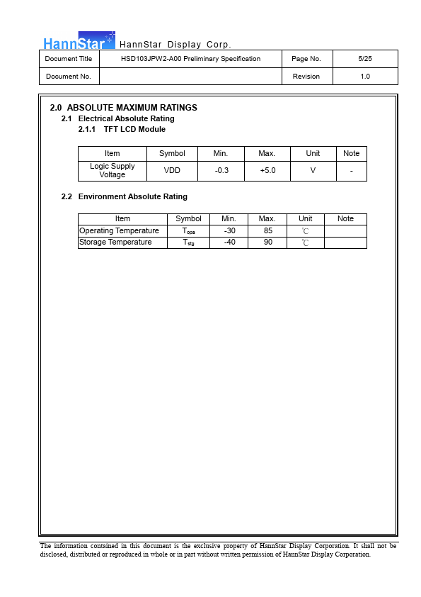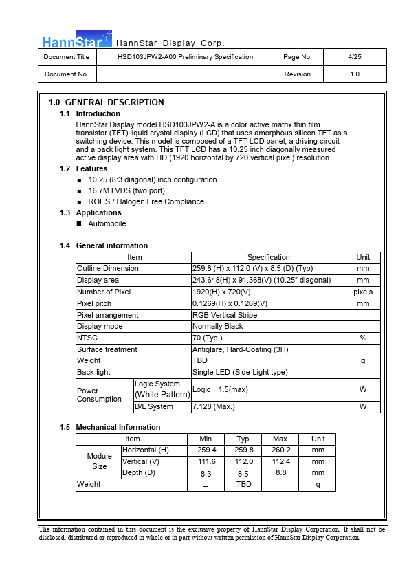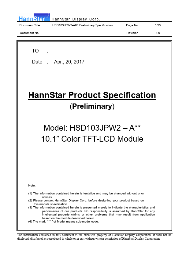 | HSD100IFW1-A01 | Color TFT-LCD Module |