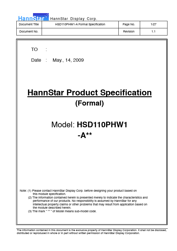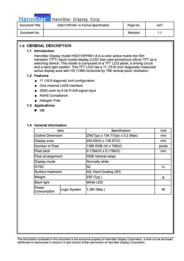 1.1 Introduction HannStar Display model HSD110PHW1-A is a color active matrix thin film transistor (TFT) liquid crystal display (LCD) that uses amorphous silicon TFT as a switching device. This model is posed of a TFT LCD panel, a driving circuit and a back light system. This TFT LCD has a 11 (16:9) inch diagonally measured active display area with HD (1366 horizontal by 768 vertical pixel) resolution.