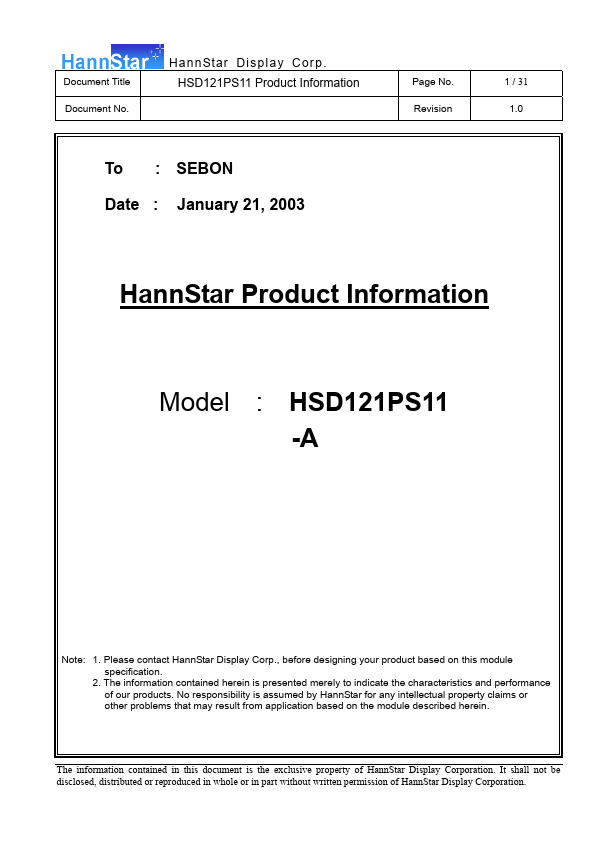 | HSD121PHW1-A01 | Color TFT-LCD Module |