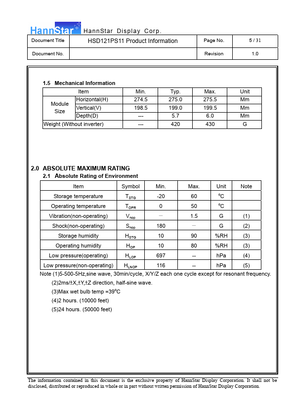 | HSD121PHW1-B00 | TFT LCD Panel |