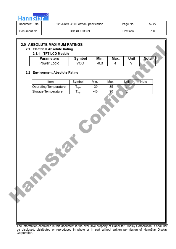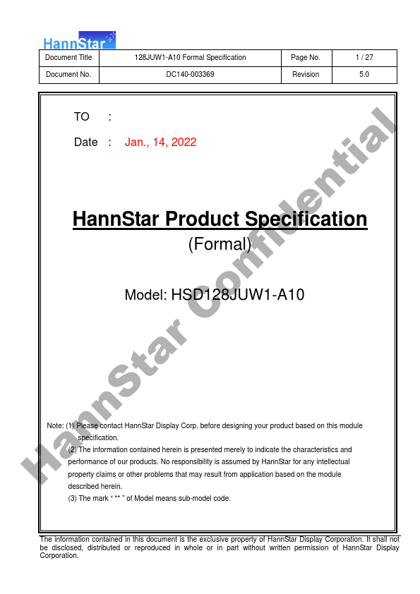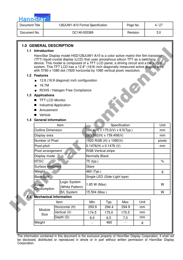 1.1 Introduction HannStar Display model HSD128JUW1-A10 is a color active matrix thin film transistor l (TFT) liquid crystal display (LCD) that uses amorphous silicon TFT as a switching device. This model is posed of a TFT LCD panel, a driving circuit and a back light system. This TFT LCD has a 12.8” (16:9) inch diagonally measured active display area ia with 5760 x 1080 dot (1920 horizontal by 1080 vertical pixel)...