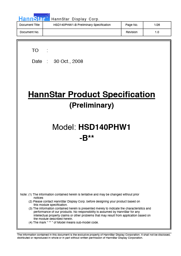 1.1 Introduction HannStar Display model HSD140PHW1-B is a color active matrix thin film transistor (TFT) liquid crystal display (LCD) that uses amorphous silicon TFT as a switching device. This model is posed of a TFT LCD panel, a driving circuit and a back light system. This TFT LCD has a 14 (16:9) inch diagonally measured active display area with HD (1366 horizontal by 768 vertical pixel) resolution.